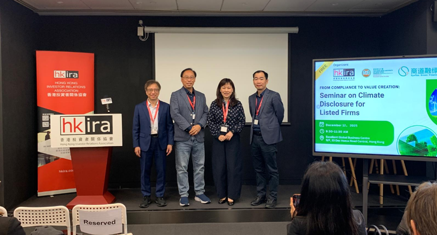 2025年12月12日,由商道融绿携手香港恒生大学ESG研究中心、香港投资者关系协会联合主办的“从合规到价值:上市公司气候披露实战研讨会”在香港成功举行。来自在港上市公司的三十多人参加了此次实战研讨会,围绕气候披露最新监管要求、量化分析方法及企业实操落地等核心议题展开深度交流。