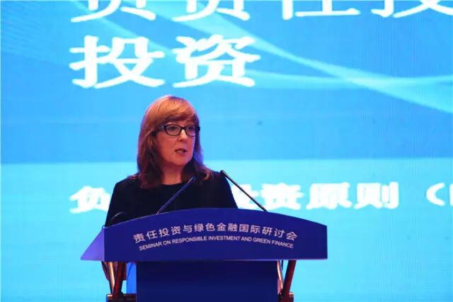 联合国责任投资原则(UN PRI)的董事总经理Fiona Reynolds女士高度评价了中国在推动绿色金融方面的成就,并对PRI的六项“责任投资原则”进行了介绍,明确了责任投资与投资收益之间的联系,即责任投资无需放弃收益,可持续的投资将为投资人带来更为稳定的长期回报。PRI计划发展更多中国机构投资者加入PRI、发布中文版指南、加强培训与能力建设、与全球投资者进行同行之间的经验交流、与中国的大学进行交流。