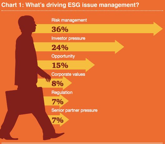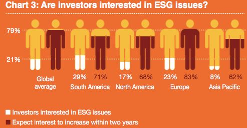 目前,有社会责任尽调的PE凤毛麟角。在国内几乎没有,我们(商道融绿)近几年受委托给一些PE投的项目做ESG尽调,基本上都是老外背景的PE。总的来说,老外PE做社会责任尽调有三类原因:(1)价值观的原因,道不同就不坚决不投;(2)金主(LP)的压力,执行人(GP)只好照做;(3)风险管理的需要,要规避因为环境与社会因素导致的风险。这一观点与普华永道2013年所做的一项调查基本吻合(Chart 1)。好消息是,普华永道认为,会有越来越多的投资者(特别是欧洲投资者)关心投资项目的ESG因素(Chart 3)。过去几年的情形看,普华的判断大致还是对的。